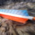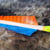 Federn LW 5" shield; gestreifte Cockfeder in hellblau und zwei einfarbige Henfedern in orange. Klassische Bohning Nocke.